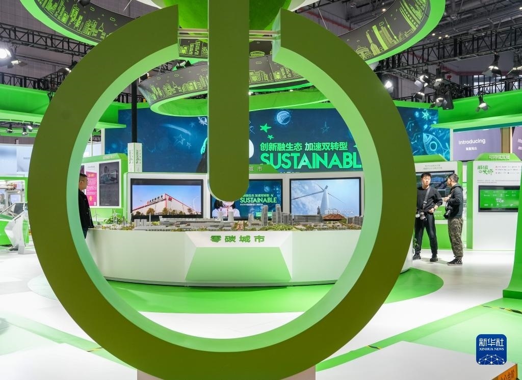 這是第六屆中國國際進(jìn)口博覽會(huì)施耐德電氣展臺(tái)展出的“零碳城市”愿景模型(2023年11月9日攝)。新華社記者 丁汀 攝