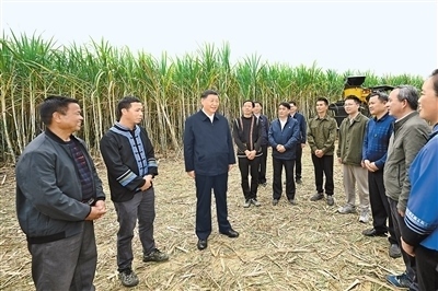14日下午,習(xí)近平到來(lái)賓市考察調(diào)研。在國(guó)家現(xiàn)代農(nóng)業(yè)產(chǎn)業(yè)園黃安優(yōu)質(zhì)“雙高”糖料蔗基地,習(xí)近平察看萬(wàn)畝甘蔗林和機(jī)械化作業(yè)收割場(chǎng)景,聽(tīng)取基地情況介紹。他走進(jìn)甘蔗林,詳細(xì)了解甘蔗良種繁育技術(shù)要領(lǐng),同蔗農(nóng)、農(nóng)機(jī)手和農(nóng)技人員親切交流。習(xí)近平指出,廣西是我國(guó)蔗糖主產(chǎn)區(qū),要把這一特色優(yōu)勢(shì)產(chǎn)業(yè)做強(qiáng)做大,為保障國(guó)家糖業(yè)安全、促進(jìn)蔗農(nóng)增收致富發(fā)揮更大作用。要積極培育和推廣良種、提高機(jī)械化作業(yè)水平,建設(shè)好現(xiàn)代農(nóng)業(yè)產(chǎn)業(yè)園。要探索建立更加穩(wěn)定的利益聯(lián)結(jié)機(jī)制,讓廣大農(nóng)民共享農(nóng)村改革和發(fā)展成果。他祝愿鄉(xiāng)親們的生活像甘蔗一樣甜蜜。