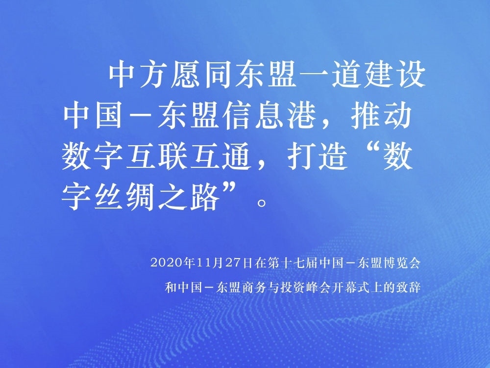 2014年,中國提出與東盟十國共建“中國-東盟信息港”倡議,得到了東盟各國的積極響應。在第十七屆中國-東盟博覽會和中國-東盟商務與投資峰會開幕式上,習近平總書記提出“提升科技創(chuàng)新,深化數(shù)字經(jīng)濟合作”的重要倡議,表示中方愿同東盟各國攜手合作,抓住新一輪科技革命和產(chǎn)業(yè)變革機遇,發(fā)揮互補優(yōu)勢,聚焦合作共贏。