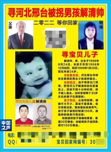 “我是被遺棄的,還是被拐賣的”,這是解清帥得知自己親生父母的消息時(shí),最關(guān)心的問(wèn)題。看到警察出示的印有父母和自己嬰兒時(shí)期照片的尋人啟事,解清帥繃不住了,他說(shuō)一定要相認(rèn)。