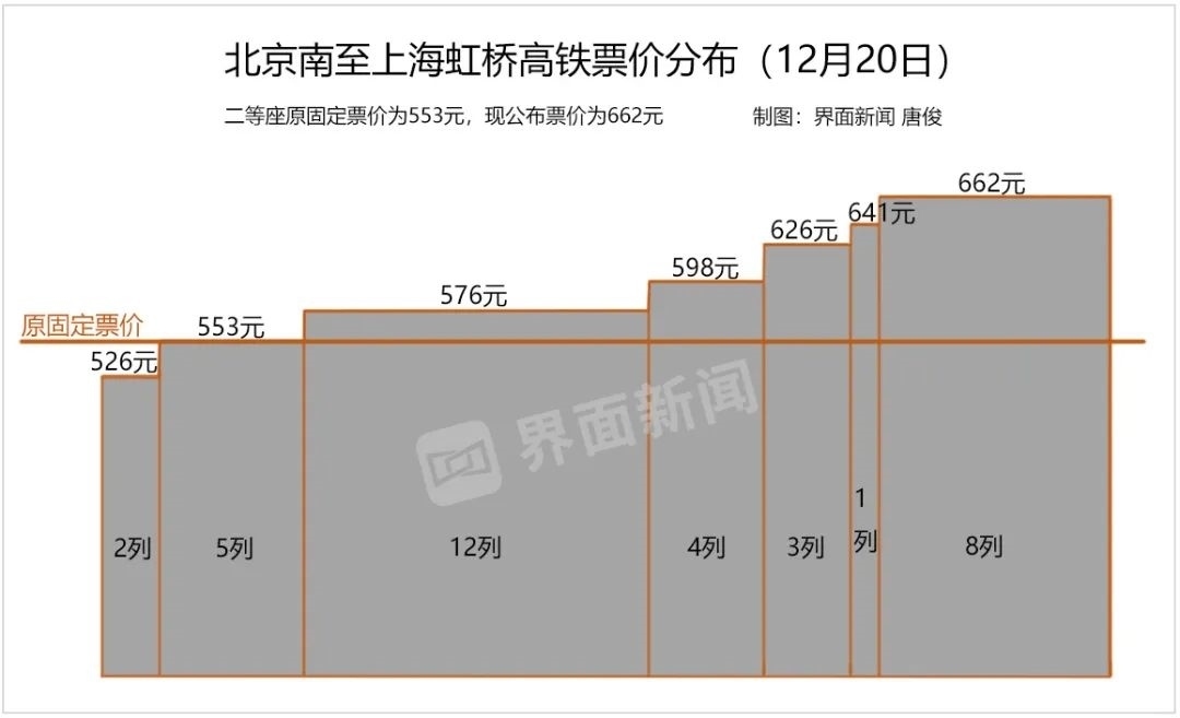 以京滬高鐵為例,此前全程二等座的固定票價為553元,現(xiàn)在的公布票價為662元。12月20日,北京南站至上海虹橋站開行35趟列車,其中只有2趟列車二等座票價低于553元,有5趟列車與原固定票價持平,其余80%列車高于原票價。漲價的列車中,8趟列車的實際票價與公布票價(662元)一致。