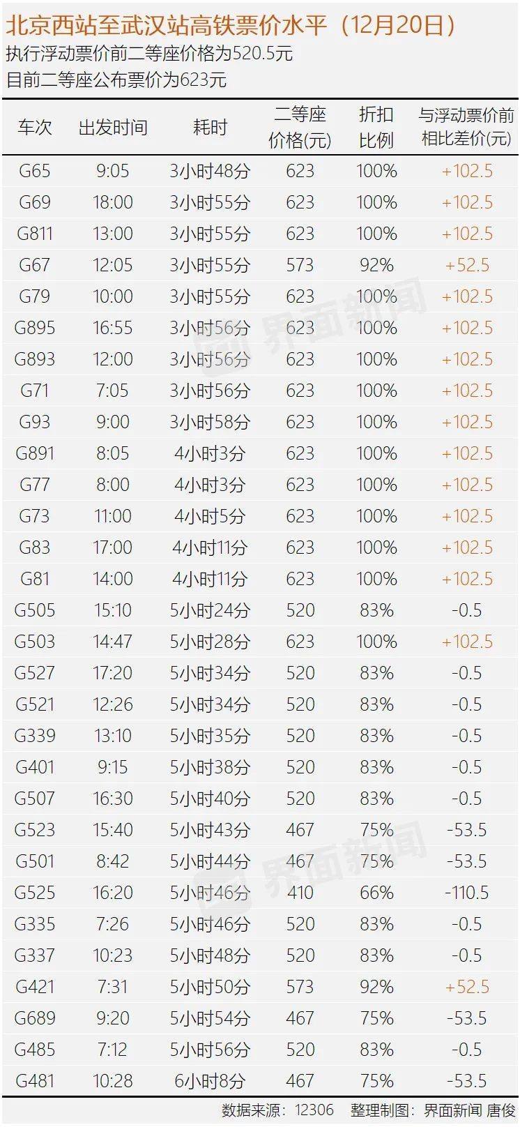 根據(jù)界面新聞統(tǒng)計,12月20日,北京西站至武漢站共有30趟高鐵開行,其中16趟列車與原來相比票價上漲,14趟列車票價下降。票價上漲的列車中,大部分按照最高的公布票價定價,相當于上漲了102.5元;票價下降的列車中,只有少數(shù)列車降低了50多元。