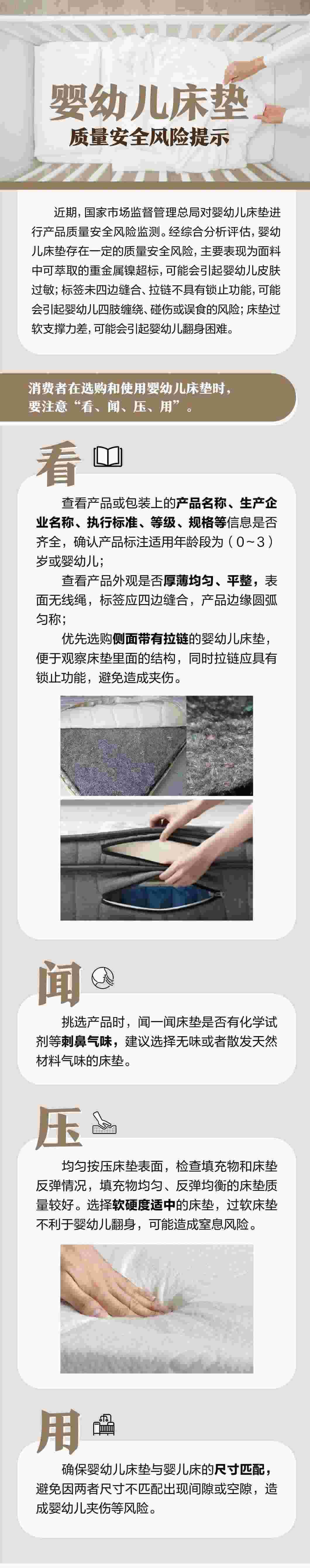 嬰幼兒床墊存在一定的質量安全風險,主要表現(xiàn)為面料中可萃取的重金屬鎳超標,可能會引起嬰幼兒皮膚過敏;標簽未四邊縫合、拉鏈不具有鎖止功能,可能會引起嬰幼兒四肢纏繞、碰傷或誤食的風險;床墊過軟支撐力差,可能會引起嬰幼兒翻身困難。