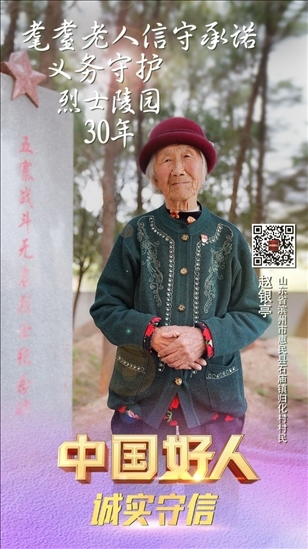 趙銀亭,女,1929年10月生,中共黨員,山東省濱州市惠民縣石廟鎮(zhèn)歸化村村民。趙銀亭是一位有75年黨齡的老黨員。1992年,當(dāng)?shù)亟⒘沂苛陥@,需要一位守陵人,63歲的趙銀亭主動(dòng)報(bào)了名。自此,她與丈夫搬到了距烈士陵園不過15米的舊屋居住。30多年來(lái),她堅(jiān)守信仰,守護(hù)烈士陵園,為前來(lái)參觀的人員講述英烈故事。