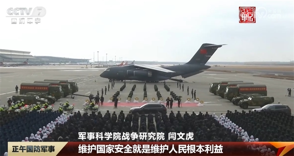 守護(hù)國防安全,我們每個(gè)人都是衛(wèi)士。今年11月,我們第十次迎回了抗美援朝保家衛(wèi)國的烈士遺骸。11月23日上午,遼寧沈陽桃仙國際機(jī)場,兩架殲-20戰(zhàn)機(jī)護(hù)航運(yùn)-20運(yùn)輸機(jī)呼嘯而來,運(yùn)-20降落,緩緩?fù)ㄟ^水門,以最高禮儀致敬英烈。