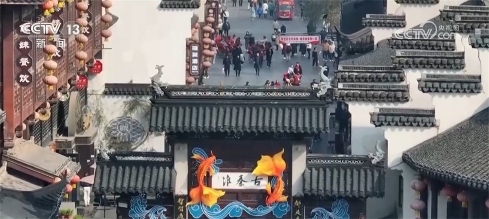 ??????新年將至,南京秦淮河畔的各式花燈陸續(xù)落成,與古建筑相互映襯。碧水繞城,畫(huà)舫穿行,裝扮后的古城如畫(huà)如詩(shī)。在“古秦淮”的牌坊上,魚(yú)躍龍門(mén)的造型立體生動(dòng)。人們穿過(guò)牌坊,采買(mǎi)年貨,拍照留念。在夫子廟南側(cè)的門(mén)東歷史文化街區(qū),一條大龍?jiān)煨偷幕粢莱菈Χ?。十二生肖燈組活靈活現(xiàn),讓古樸的街巷增添了迎新的色彩。