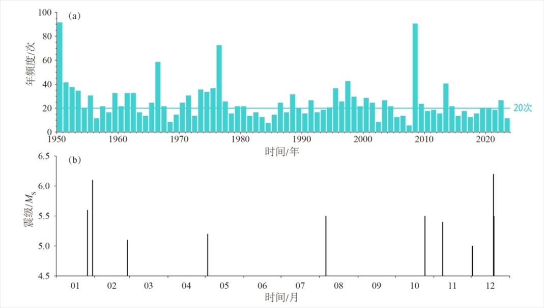 2023年以來大陸地區(qū)發(fā)生5級以上地震11次,最大為12月18日甘肅積石山6.2級地震,活動水平較2022年(27次,最大為2022年1月8日青海門源6.9級地震)和歷史平均水平(20次)明顯偏弱(圖a)。2023年5級以上地震時間分布不均勻,1月至2月發(fā)生3次,3月至9月僅發(fā)生2次,10月至12月增至6次,出現(xiàn)5級以上地震由弱轉(zhuǎn)強的活動特征(圖b)。
