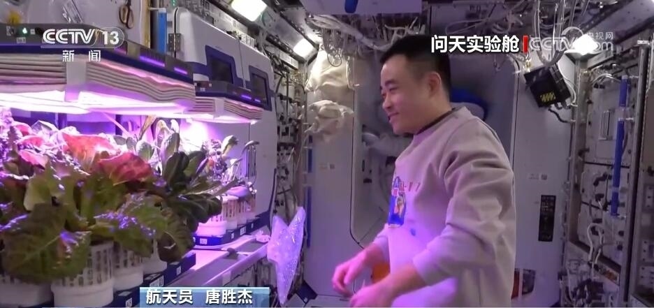 航天員 唐勝杰:你好,我正在對我們的櫻桃番茄進(jìn)行授粉。因為太空沒有小蜜蜂,我就是那只小蜜蜂。大家看一看,這是我們的太空蔬菜,神十七乘組在“太空出差”期間,我們的太空菜園變得更大了,大家看看我們的蔬菜是不是長勢喜人?今天是新年的第一天,江新林為我們準(zhǔn)備了營養(yǎng)豐盛的太空午餐,但是我覺得今天應(yīng)該再增加一點綠色的、新鮮的蔬菜,午餐就會變得更豐盛了。大家可以看一看,看看我們的櫻桃番茄。誒,拿這兩杯,今天中午我們就吃這兩杯。