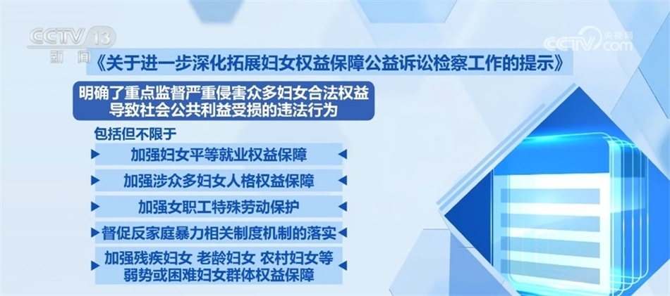 最高檢相關(guān)部門負責(zé)人介紹,2023年1月1日,修訂后的《中華人民共和國婦女權(quán)益保障法》正式施行,明確授權(quán)檢察機關(guān)開展婦女權(quán)益保障領(lǐng)域公益訴訟。實踐中,侵害婦女權(quán)益的違法情形往往存在一定的隱蔽性、復(fù)雜性?!豆ぷ魈崾尽芬?,要善于從刑事案件中發(fā)現(xiàn)普遍性、源頭性問題,強化訴源治理;要針對具體情況和具體問題,研判是否存在違法性和公益損害;要注意結(jié)合侵害婦女權(quán)益的不同違法情形,精準(zhǔn)確定監(jiān)督對象和監(jiān)督方式,充分實現(xiàn)公益保護目的。