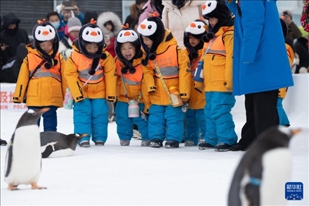 1月6日,在哈爾濱極地公園,“小砂糖橘”與企鵝進(jìn)行互動。新華社記者 張濤 攝