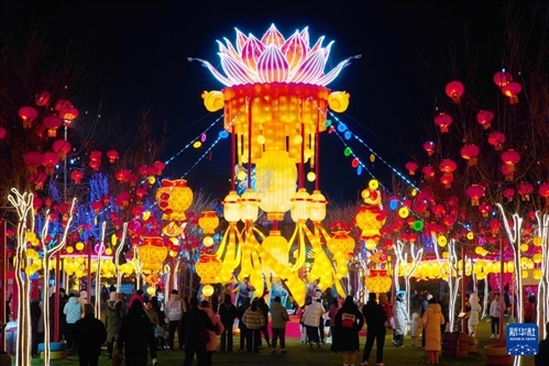 1月4日,人們在2024年淄博玉黛湖花燈會上賞燈游覽。新華社記者 徐速繪 攝