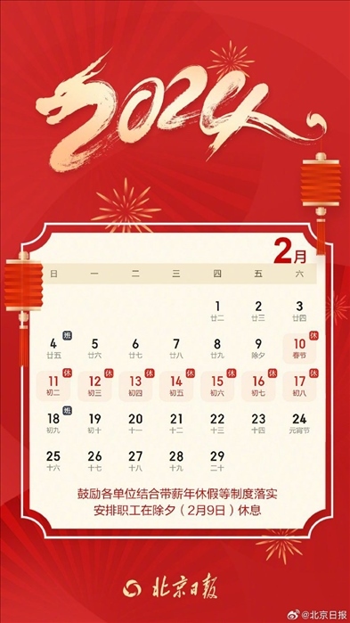 ·北京正式發(fā)布春節(jié)放假安排,鼓勵各單位結(jié)合年假等安排除夕休息。