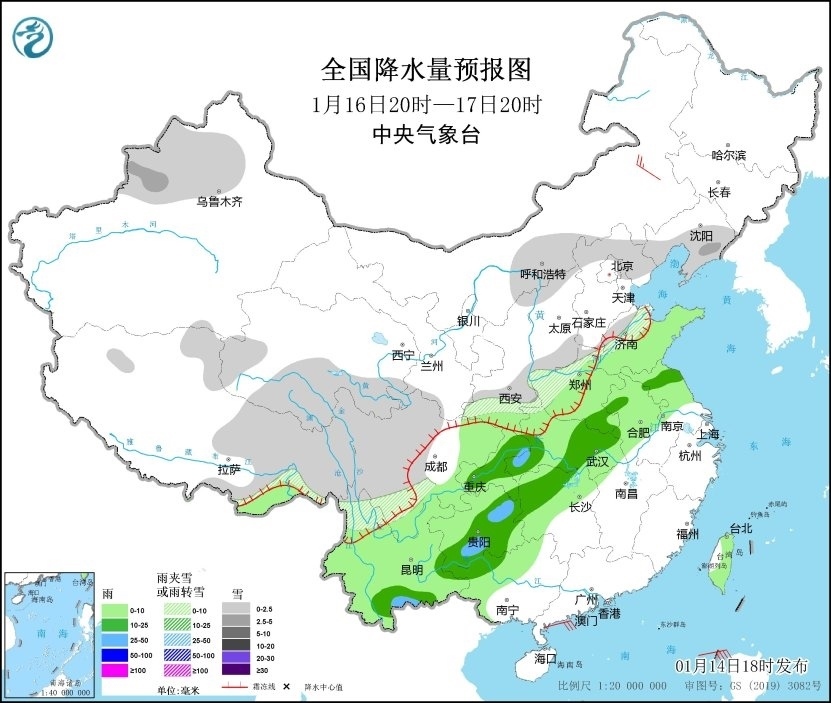 1月16日20時至17日20時,新疆西部、青海南部、西藏東部、內蒙古中部、遼寧中南部、河北北部、川西高原、陜西南部、山西南部、河南西北部、山東西北部、云南西北部等地的部分地區(qū)有小到中雪或雨夾雪;黃淮大部、江淮大部、江漢、江南西部、四川東部、重慶、貴州、云南、廣西西部、臺灣島等地的部分地區(qū)有小到中雨,其中湖北西南部、貴州中部和東北部、云南南部等地的部分地區(qū)有大雨。內蒙古東南部等地的部分地區(qū)有4~5級風(見圖3)。
