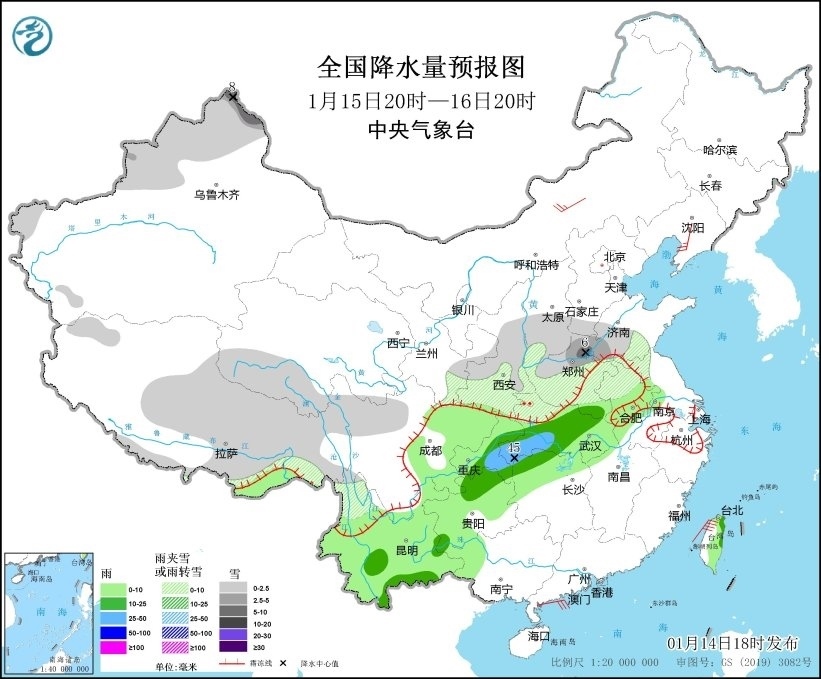 1月14日20時至15日20時,新疆北疆西北部、西藏東部、甘肅東部、陜西、山西南部、河南等地的部分地區(qū)有小到中雪,其中新疆阿勒泰、陜西南部、河南西部等地的部分地區(qū)有大雪,局地暴雪(10~12毫米),陜西南部、湖北西北部局地有凍雨;西南地區(qū)東部、江漢中西部、江南西部和東北部、廣西西部和北部、云南南部、海南島等地有小到中雨,其中重慶中北部等地局地有大雨(25~35毫米)。山東半島、江南東北部、西藏等地的部分地區(qū)有4~6級風,其中浙江東部沿海、西藏中部的部分地區(qū)風力可達7級以上(見圖1);臺灣海峽有7~8級、陣風9級的東北風,黃海、東海大部、南海中北部和西南部有5~7級風,陣風8級。