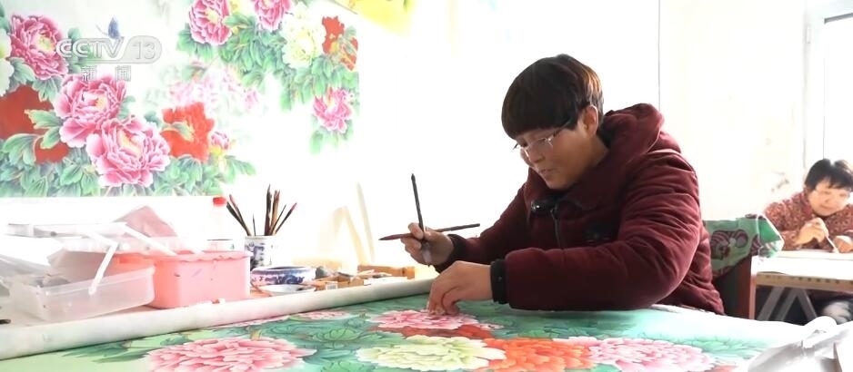 在巨野縣大義鎮(zhèn)王莊村這家新開(kāi)的畫(huà)室里,十幾位村民正在這里專(zhuān)心畫(huà)工筆牡丹畫(huà)。今年50多歲的曹春靈算是村里的老畫(huà)師了,平常農(nóng)忙的時(shí)候她就照顧家里10多畝地,農(nóng)閑的時(shí)候就作畫(huà),每個(gè)月能掙兩三千塊錢(qián)。這不臨近春節(jié)畫(huà)賣(mài)得好,她干脆把兒媳婦也叫過(guò)來(lái),她今年的新打算是,要把兒媳培養(yǎng)成畫(huà)師。