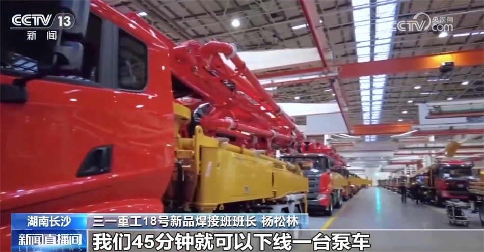 三一重工18號(hào)新品焊接班班長(zhǎng) 楊松林:大家好,我是新品焊接班班長(zhǎng)楊松林。我們工廠主要是生產(chǎn)泵車(chē),看,就是我身后的這個(gè)大家伙。我們45分鐘就可以下線(xiàn)一臺(tái)泵車(chē)。