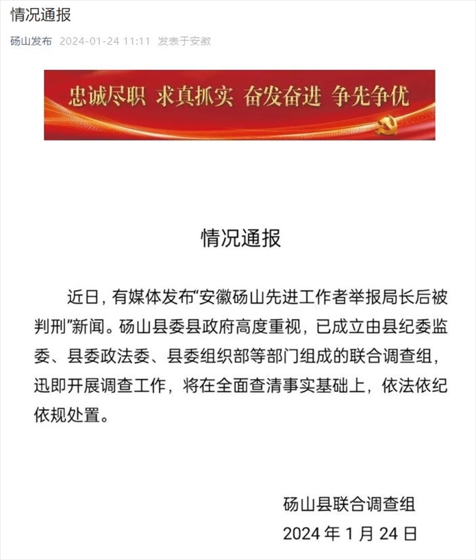 ·安徽碭山先進(jìn)工作者舉報(bào)局長(zhǎng)后被判刑?碭山縣回應(yīng):已成立聯(lián)合調(diào)查組迅即開(kāi)展調(diào)查工作,將在全面查清事實(shí)基礎(chǔ)上,依法依紀(jì)依規(guī)處置。