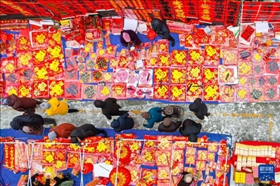 春節(jié)臨近,各地張燈結(jié)彩。人們逛花市、賞花燈、置辦年貨,年味漸濃。這是無(wú)人機(jī)拍攝的1月22日山東省青島市李村大集,人們?cè)谶x購(gòu)春節(jié)飾品。