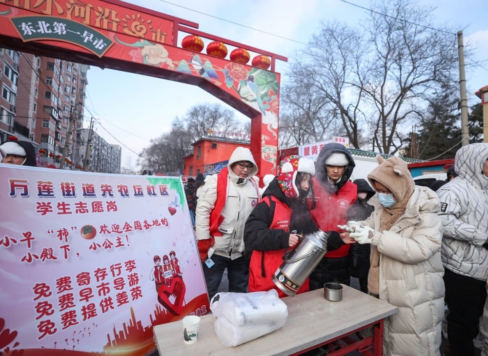 ?2024年1月21日,在遼寧沈陽小河沿早市,志愿者為游客提供免費熱水。新華社記者 龍雷 攝