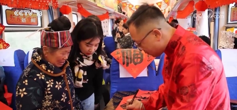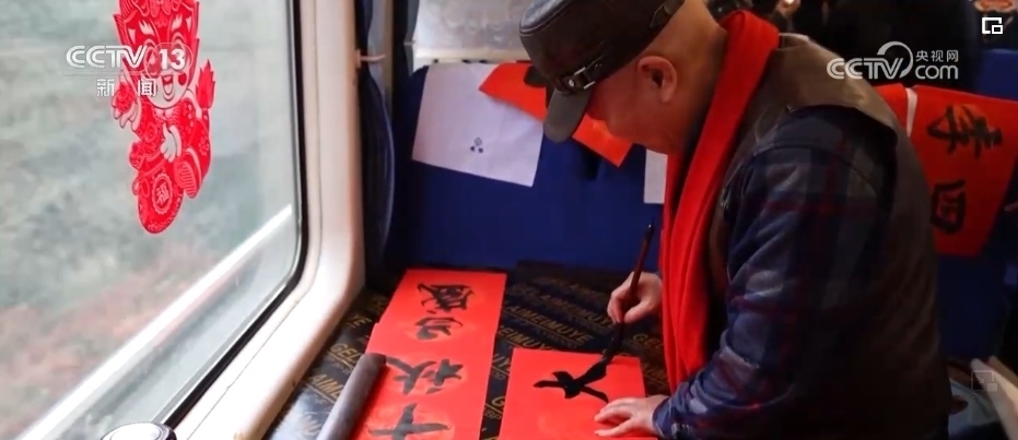 春節(jié)臨近,列車(chē)的車(chē)廂裝扮一新。鐵路部門(mén)還邀請(qǐng)了書(shū)法愛(ài)好者給旅客們寫(xiě)春聯(lián)、送福字,為大家送出新春祝福。