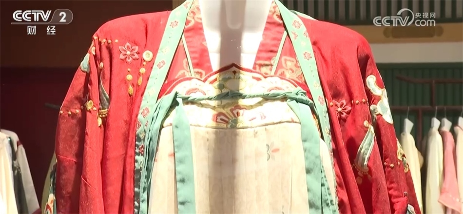 總臺(tái)記者 秦祎:我旁邊的這件就是店內(nèi)最受歡迎的唐裝之一——花想容,這件衣服里面是一件唐裝的基礎(chǔ)款造型齊胸襦裙,披上外披則是貴妃造型,如果擔(dān)心天氣冷可以像我一樣加上斗篷。