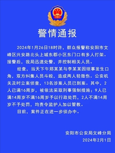 ·河南安陽警方通報(bào)一起斗毆案:2人因瑣事爭(zhēng)執(zhí)糾集多人斗毆,13人已到案,其中11人不滿16歲。