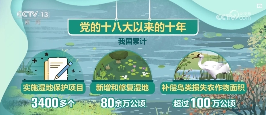 黨的十八大以來(lái)的十年,我國(guó)累計(jì)實(shí)施濕地保護(hù)項(xiàng)目3400多個(gè),新增和修復(fù)濕地80余萬(wàn)公頃,補(bǔ)償鳥(niǎo)類損失農(nóng)作物面積超過(guò)100萬(wàn)公頃。