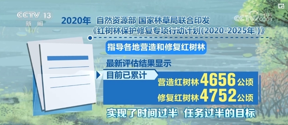 2020年,自然資源部、國(guó)家林草局聯(lián)合印發(fā)《紅樹(shù)林保護(hù)修復(fù)專項(xiàng)行動(dòng)計(jì)劃(2020—2025年)》,指導(dǎo)各地營(yíng)造和修復(fù)紅樹(shù)林。最新評(píng)估結(jié)果顯示,目前,已累計(jì)營(yíng)造紅樹(shù)林4656公頃,修復(fù)紅樹(shù)林4752公頃,實(shí)現(xiàn)了時(shí)間過(guò)半、任務(wù)過(guò)半的目標(biāo)。