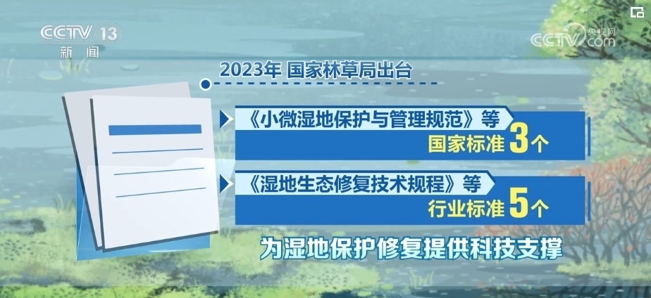 2023年,國(guó)家林草局出臺(tái)《小微濕地保護(hù)與管理規(guī)范》等國(guó)家標(biāo)準(zhǔn)3個(gè)、《濕地生態(tài)修復(fù)技術(shù)規(guī)程》等行業(yè)標(biāo)準(zhǔn)5個(gè),為濕地保護(hù)修復(fù)提供科技支撐。