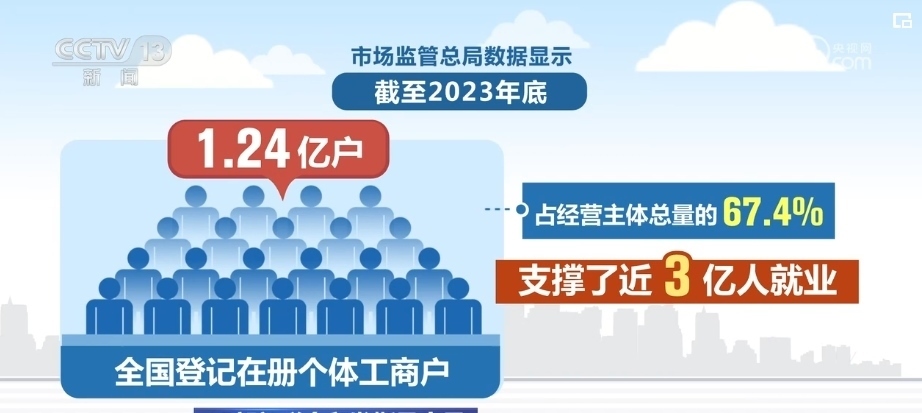 市場監(jiān)管總局?jǐn)?shù)據(jù)顯示,截至2023年底,全國登記在冊(cè)個(gè)體工商戶1.24億戶,占經(jīng)營主體總量的67.4%,支撐了近3億人就業(yè)。