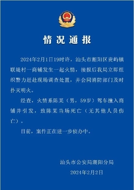 ·汕頭一男子駕車撞入商鋪引發(fā)火情,其當場死亡。