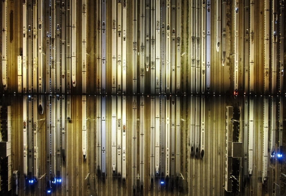 2024年1月26日凌晨,動車組列車??吭趶V州動車段的存車線上(無人機照片)。新華社記者 鄧華 攝