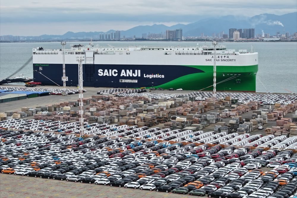 2024年1月23日,“上汽安吉申誠”號汽車滾裝船停靠在福建廈門東渡港區(qū)現(xiàn)代碼頭(無人機照片)。新華社記者 姜克紅 攝