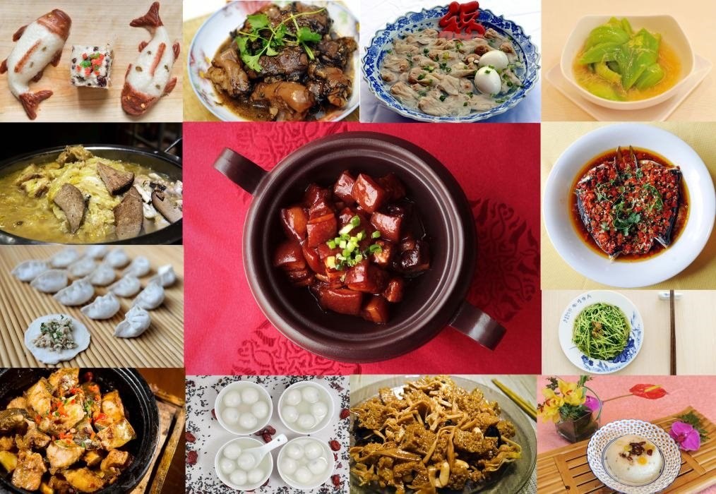 2014年拍攝的拼版照片:“一桌年夜飯”,依次為年糕、發(fā)菜豬手、扁肉燕、長年菜、殺豬菜、餃子、紅燒肉、鴻運當頭、安豆苗、臭鱖魚、湯圓、四喜烤麩、八寶飯(從左至右、從上至下)。