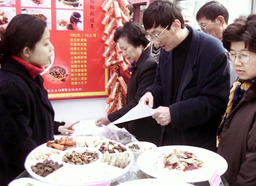 2002年2月2日,上海市民在位于南京西路休閑街區(qū)的 “年夜飯一條街”上選擇、預訂年夜飯。