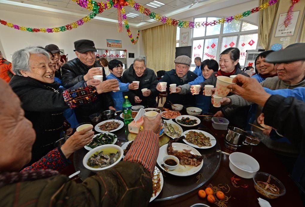 2016年2月7日,江西南昌一福利院里的老人們與護理員一起吃年夜飯。