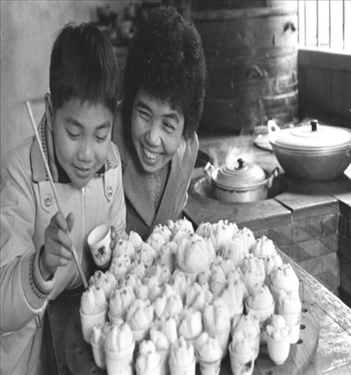 1980年,福建泉州歸僑陳素珍教她的小兒子在年糕上點紅。