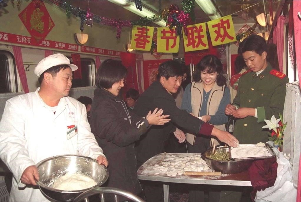 2000年2月5日,天津開往廣州的一列列車上,工作人員為旅客準備了熱氣騰騰的餃子,還精心編排了豐富多彩的文藝節(jié)目。