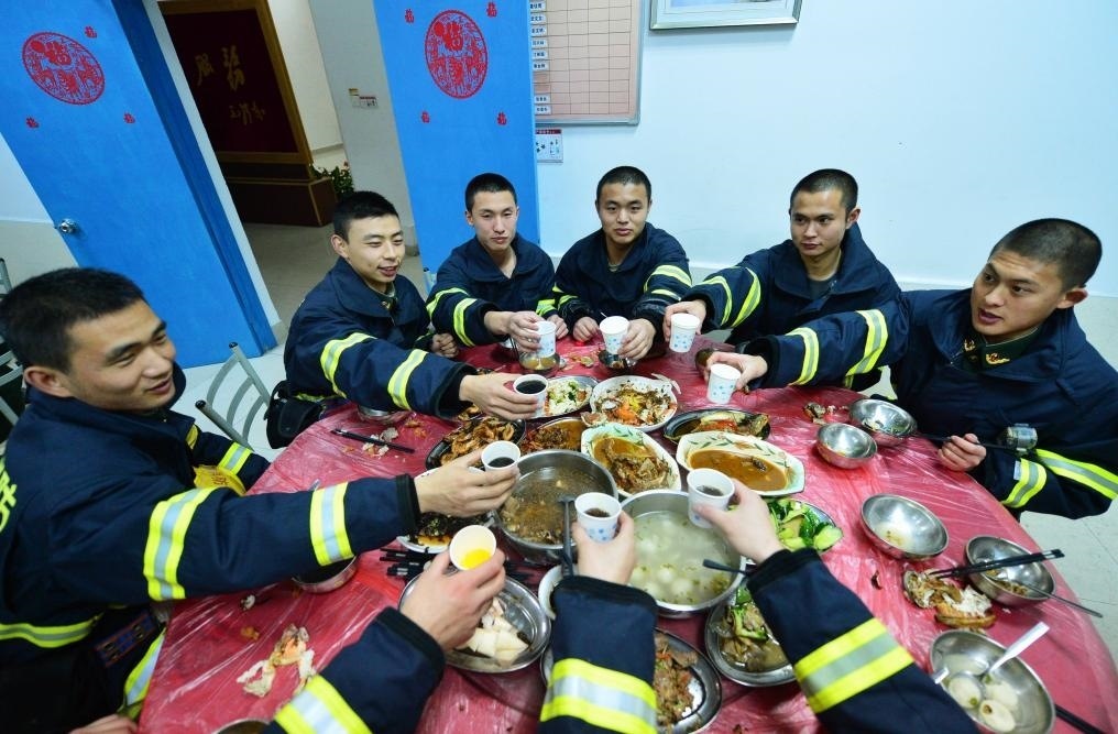 2015年2月18日,福州市鼓樓區(qū)消防大隊三坊七巷消防中隊的消防員吃年夜飯。