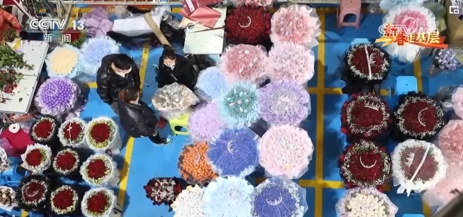 春節(jié)期間五彩繽紛、種類繁多的年宵花成為主角,玫瑰、臘梅、郁金香都是市場“寵兒”。這幾天,周琦他們的日訂單量已經從2500單增加到3000多單。