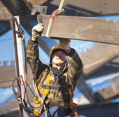 工人在北京城市副中心站綜合交通樞紐施工現(xiàn)場(chǎng)作業(yè)。