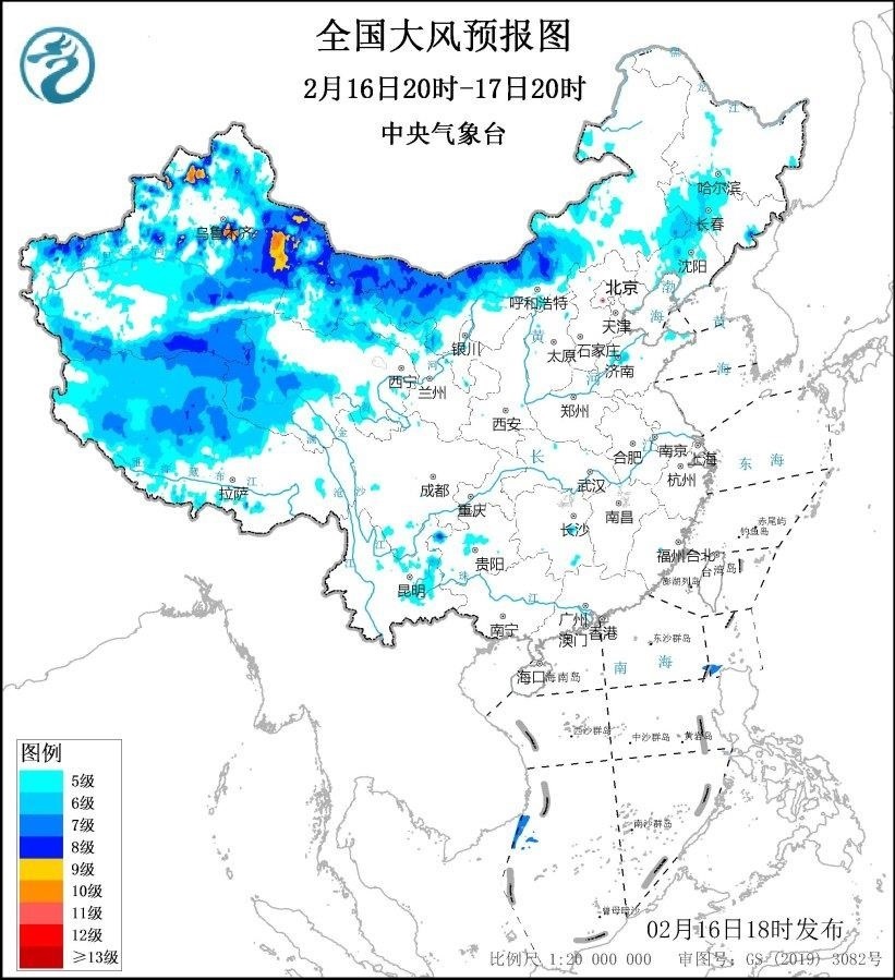 預(yù)計,2月16日20時至17日20時,新疆北疆東部和南疆盆地、內(nèi)蒙古中西部、青海西部、西藏西部、甘肅西部、遼寧西部、吉林西部等地將有5~7級、陣風(fēng)8~10級的大風(fēng),新疆山口地區(qū)風(fēng)力可達(dá)12級,陣風(fēng)13~15級。