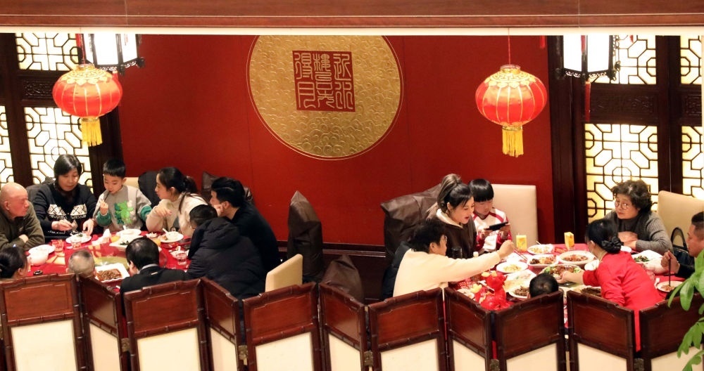 2024年2月9日,人們?cè)诮K省蘇州市一家餐館內(nèi)享用團(tuán)圓飯。新華社發(fā)(杭興微 攝)