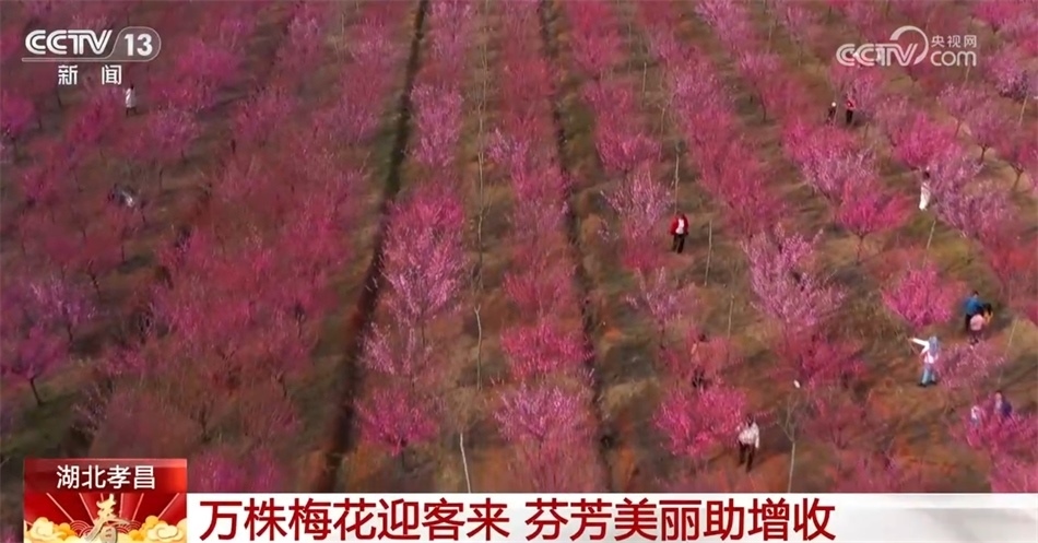 在湖北孝感孝昌縣鄒崗鎮(zhèn),萬(wàn)株梅花也競(jìng)相綻放,吸引了眾多市民游客來(lái)此“尋梅”。走進(jìn)梅園,一簇簇梅花綴滿枝頭,蜜蜂飛舞其間,市民游客漫步在花海中,拍照記錄美好風(fēng)景。