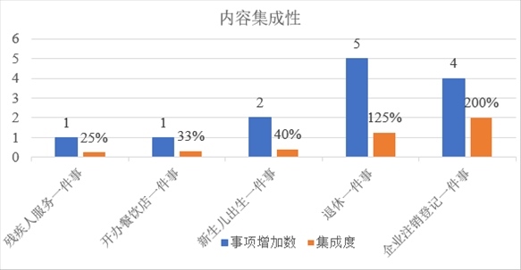 從內(nèi)容集成度看,5項(xiàng)相關(guān)“一件事”的事項(xiàng)集成比例均有不同程度提升?!皻埣踩朔?wù)一件事”增加1個(gè)事項(xiàng),集成度提升25%?!伴_辦餐飲店一件事”增加1個(gè)事項(xiàng),集成度提升33%。“新生兒出生一件事”增加2個(gè)事項(xiàng),集成度提升40%?!巴诵菀患隆痹黾?個(gè)事項(xiàng),集成度提升125%。“企業(yè)注銷登記一件事”增加4個(gè)事項(xiàng),集成度提升200%。