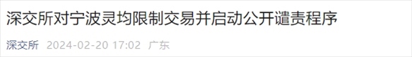 根據(jù)深交所《限制交易實施細則》《自律監(jiān)管措施和紀律處分實施辦法》等相關規(guī)定,深交所決定,從2024年2月20日起至2024年2月22日止對寧波靈均名下相關證券賬戶采取限制交易措施,限制其在上述期間買賣在深交所上市交易的所有股票,并啟動對寧波靈均公開譴責紀律處分的程序。