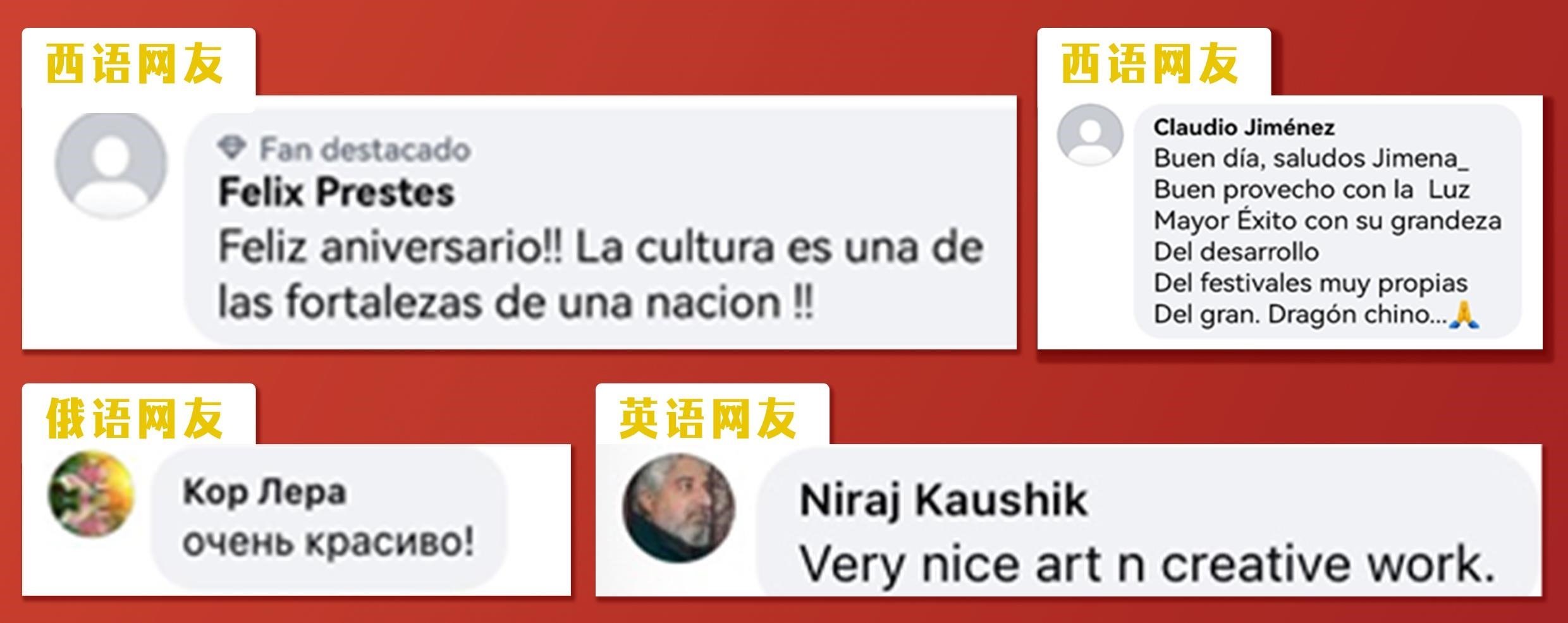 文明魅力無國界,中國文化受海外網(wǎng)友追捧。《彩云追月》《小雅·鹿鳴》《蒲公英的天空》等節(jié)目讓海外受眾領(lǐng)略了元宵晚會蘊含的文化底蘊。眾多海外網(wǎng)友紛紛留言表達了對中華文化和中國節(jié)日的喜愛。西語網(wǎng)友Claudio Jiménez留言:“中國擁有這么多自己的節(jié)日,好棒”。西語網(wǎng)友Felix Prestes說:“文化是一個國家的基石,祝你們節(jié)日快樂!”英語網(wǎng)友Niraj Kaushik和Cham Gurung評論說:“很美且很有創(chuàng)意的作品”“節(jié)目令人印象深刻,我很喜歡”。