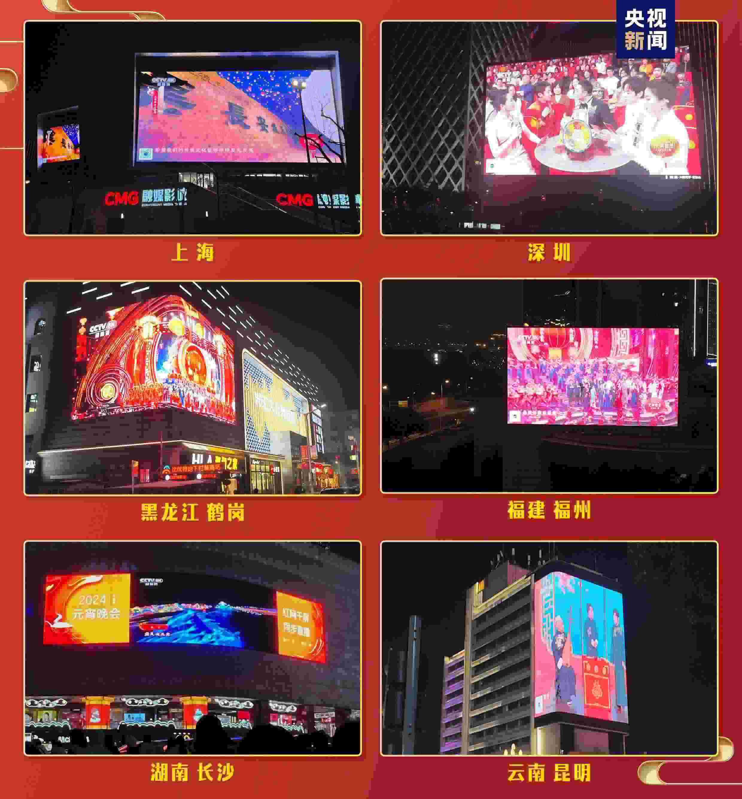 百城千屏喜“躍”街頭。元宵節(jié)當(dāng)晚,在北京、天津、上海、重慶、深圳、沈陽、長沙、成都、昆明、西寧等全國112個城市1075塊地標(biāo)大屏上同步播出元宵晚會。市民在核心商圈、生活廣場和交通樞紐等多元化場景中同步觀燈賞月看元宵晚會。