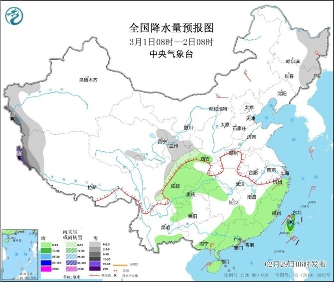 央視網(wǎng)消息:中央氣象臺網(wǎng)站2月29日消息,過去一天,全國雨雪逐漸發(fā)展增強(qiáng),北方大部以降雪為主,集中在西北地區(qū)東部、內(nèi)蒙古、山西、山東和東北三省等地;南方地區(qū)雨水范圍明顯擴(kuò)大,江蘇、上海、浙江、安徽南部、江西中北部、湖南中南部、廣西北部等地部分地區(qū)出現(xiàn)中到大雨,今天凌晨起,蘇皖北部出現(xiàn)雨轉(zhuǎn)雪,江蘇連云港、宿遷、徐州等地雪花紛飛,并伴隨低溫和大風(fēng)天氣,體感十分寒冷。