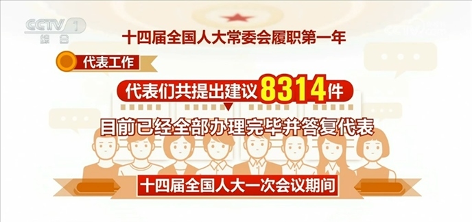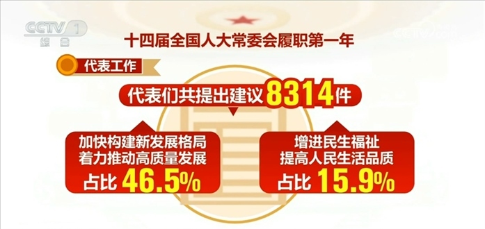 代表工作方面:十四屆全國人大一次會(huì)議期間,代表們共提出建議8314件,目前已經(jīng)全部辦理完畢并答復(fù)代表。其中,涉及加快構(gòu)建新發(fā)展格局、著力推動(dòng)高質(zhì)量發(fā)展的占比46.5%,涉及增進(jìn)民生福祉、提高人民生活品質(zhì)的占比15.9%。